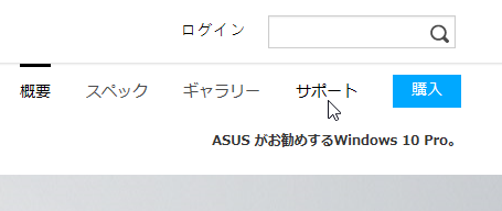 まず、自分が所有しているASUSのノートパソコン製品ページ(当サイト管理人のPCだとこちら)を開き、「サポート」タブをクリック。
