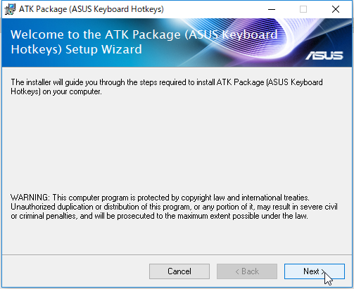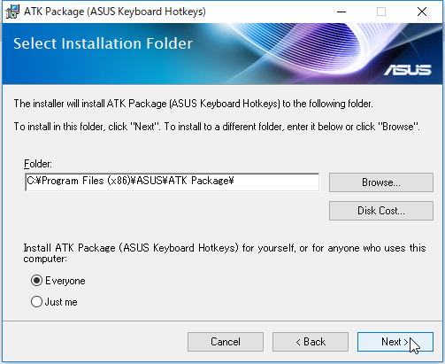 さっそく、ASUSの製品サイトのサポートページから、ATKPackageをダウンロードしてインストールしたところ、無事、ホットキーでタッチパッドの有効・無効を切り替えることができるようになりました。