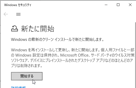 「新たに開始」は、通常のクリーンインストールのようにインストールメディアを使うことなく、Windows上から実行できるクリーンインストールです。