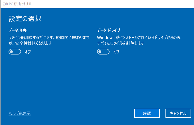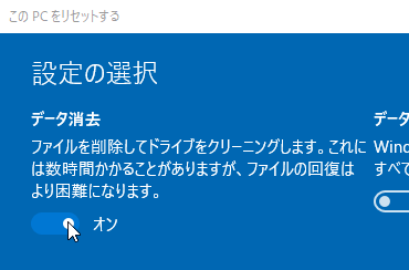 デフォルトでは「オフ」になっている「データ消去」を「オン」すると、「ファイルを削除してドライブをクリーニングします。これには数時間かかることがありますが、ファイルの回復はより困難になります。」と明記されているように、データ復元ソフトを使っても、個人データを復元される可能性はより低くなります。