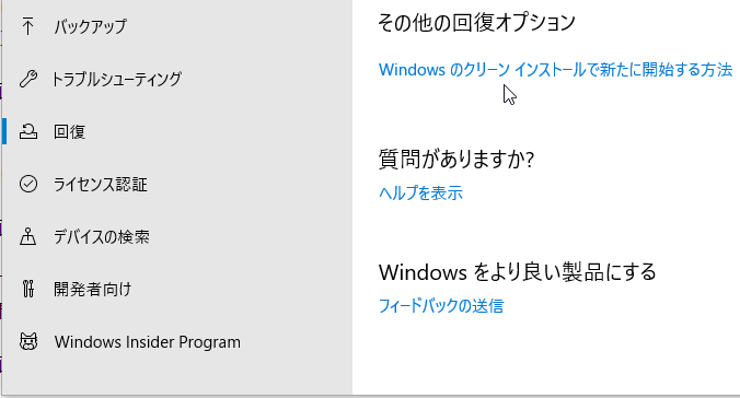 しかし、「回復」画面一番下の「その他の回復オプション」項目にある、「Windowsのクリーンインストールで新たに開始する方法」からもアクセスできます。