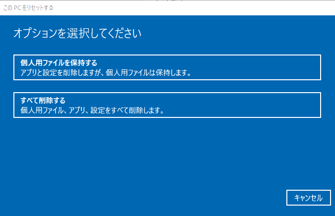 このうち、一番上の「このPCを初期状態に戻す」の「開始」ボタンをクリックすると選択できるのが、「個人用ファイルを保持する」と、「すべて削除する」という2つの初期化方法です。