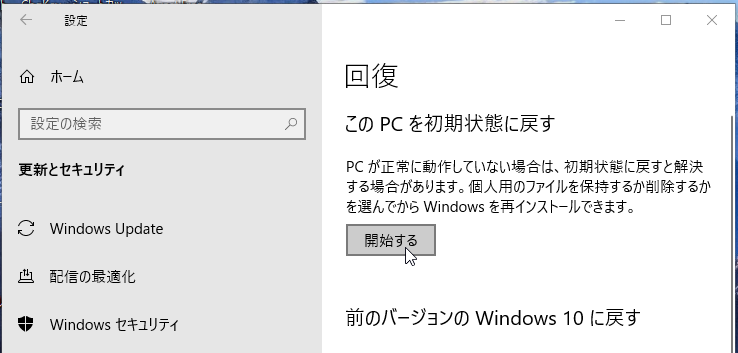 Windows 10の「設定」→「更新とセキュリティ」→「回復」画面からは現在、3つの初期化方法を選ぶことができます。