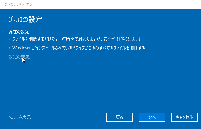 なお、「すべてを削除する」には、「追加の設定」という項目(バージョン1903以降)があります。