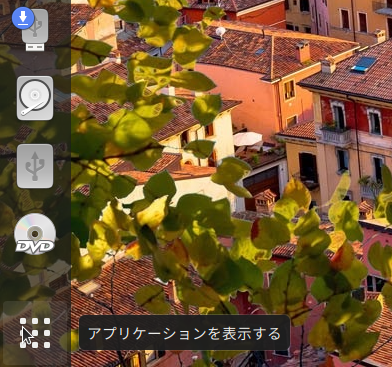 Ubuntu Linuxのデスクトップ画面左端、各種ソフト(アプリ)のアイコンが並んでいるドック(Dock)の一番下にある、格子状のドットのボタン(アプリボタン)をクリックします。