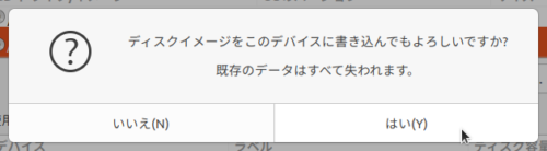 「ディスクイメージをこのデバイスに書き込んでもよろしいですか? 既存のデータはすべて失われます。」という表示が出てくるので、「はい(Y)」をクリック。