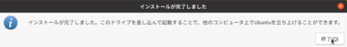 書き込みが終了すると、「インストールが完了しました。」という画面が出てくるので、「終了(O)」ボタンをクリックすればOK。
