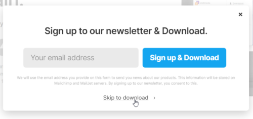 「Sign up to our newsletter & Download.」という画面が出てくるが、ニュースレターが不要なら、下の「Skip to download」をクリック。