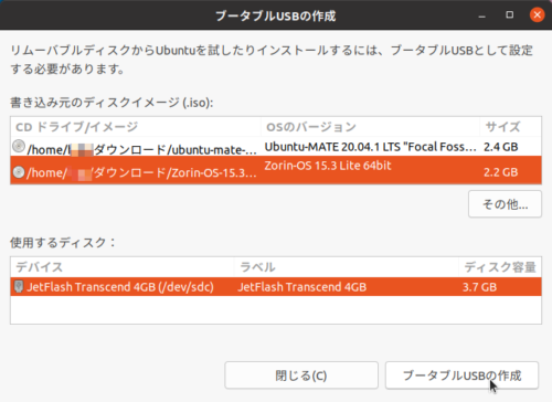 よく見てもらうと、すでに「書き込み元のディスクイメージ(.iso):」の欄には、ダウンロード済みのZorin OS 15.3 LiteのISOイメージファイルが。