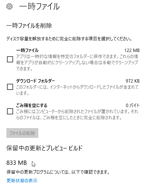 「設定」→「システム」→「ストレージ」→「ローカルストレージ」をクリックして、「ストレージ使用量」の「一時ファイル」をクリックし、一番下に保留中の更新ファイル(保留中の更新とプレビュービルド)ができている場合、これがWindows 10 Fall Creators Update(1709)の更新ファイルのインストールを邪魔しているみたいです。