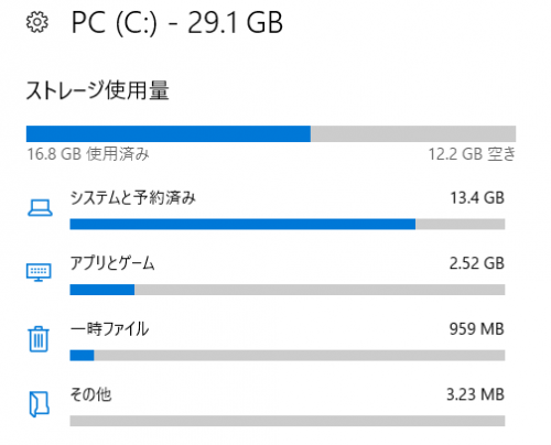 その後、Windows Updateを行って、追加の更新ファイルや足りないドライバーなどをインストールしたりで、最終的な空き容量は約12GBになりました。
