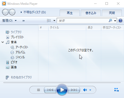 なので、光学ドライブにDVDをセットして、Windows Media Playerで再生しようとしても、「このディスクは空です。」と表示されるだけで、DVDを視聴することはできません。