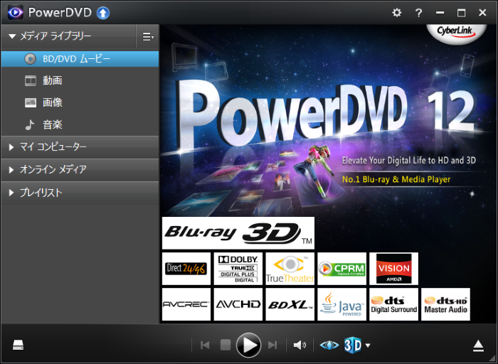 ※ 上記画像は、管理人が最近購入した内蔵ブルーレイドライブ製品に付属(バンドル)していた、型落ちのPowerDVD。時代遅れ感満載のインターフェイスですが(笑)、最新版のPowerDVDはもっとかっこいいのでご心配なく。