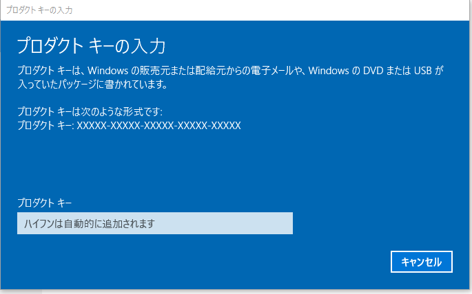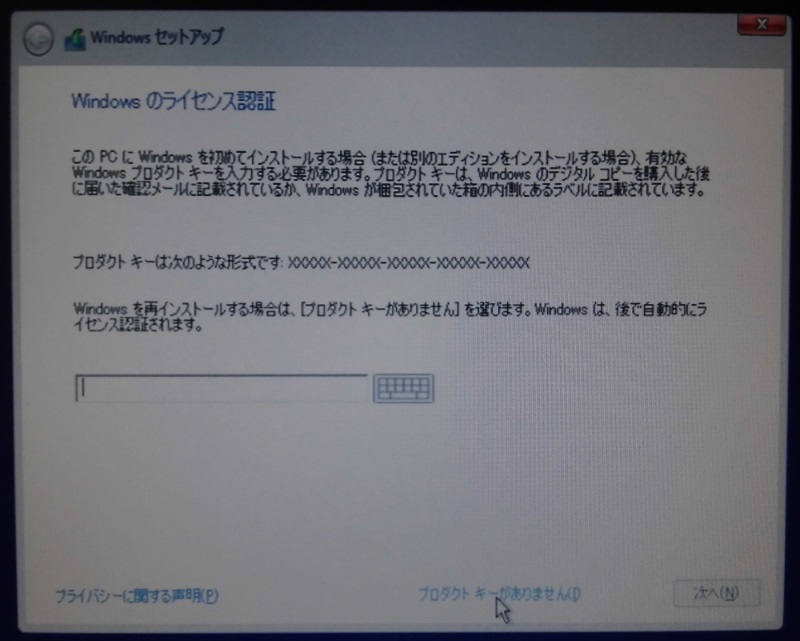 ただ、前回との違いは、Windows 8.1ノートパソコンの時には出てこなかったプロダクトキーの入力(ライセンス認証)画面が出てきたのと、「インストールするオペレーティングシステムを選んでください(S)」画面が出てきたこと。