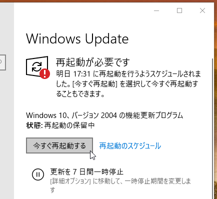 Windows 10 May 2020 Update(2004)への強制アップデートの通知が、ついにこのPCにもやって来ました。