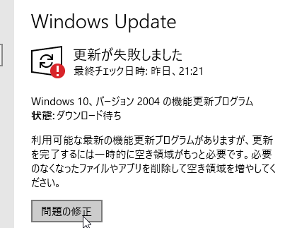 今回の「2004」は、いつものようにディスク領域不足で更新プログラムのインストールに失敗という通知が。