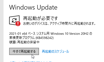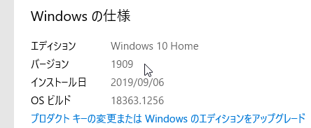 ※ 実際には、気がつかないうちにバージョンが1909になってました。2020年11月に、「Feature Update to Windows 10 Version 1909 via Enablement Package」という、通常のWindows Updateとしてインストールされていたようです。
