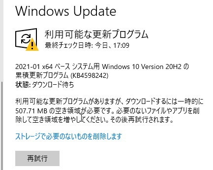 ストレージ容量が約508MBていど足りなかったため、「20H2」の累積更新プログラム、「KB4598242」がインストールできなかったようです。