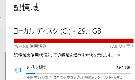 そこで、「設定」→「システム」→「記憶域」から調べてみると、ストレージの空き容量がわずか77.8MB。