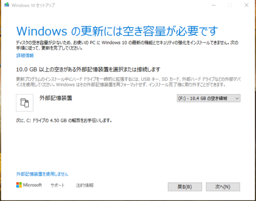 そこで、まず最初に行ったのは、更新プログラムの指示にしたがい、「空き容量が10GB以上ある外部記憶装置」を利用する方法。