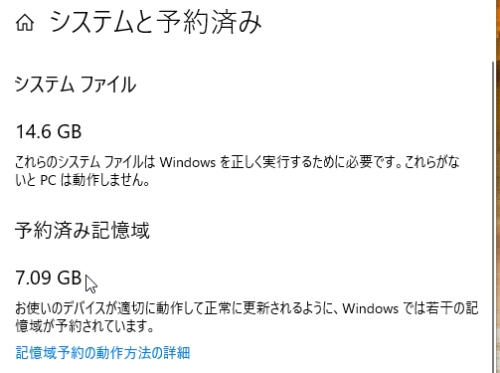 さっそく、「設定」→「システム」→「記憶域」→「システムと予約済み」で確認してみると、7.09GBもの予約済み記憶域が確保されていました。