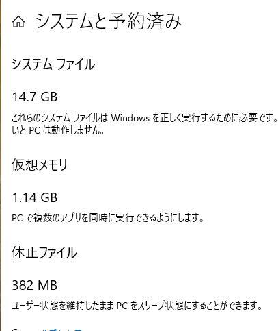 「設定」→「システム」→「記憶域」→「システムと予約済み」で確認しても、「予約済み記憶域」の項目がなくなっています。