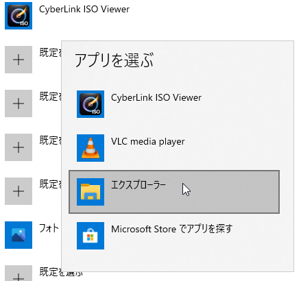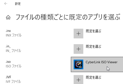 「ファイルの種類ごとに既定のアプリを選ぶ」画面が出てくるので、左サイドから「.iso」を探し、設定されている既定のアプリをクリックします。