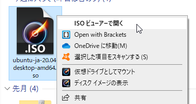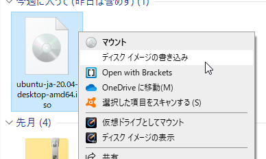 Windows 10標準のISOイメージファイル書き込み機能を利用しようと、ダウンロードしたUbuntuのISOイメージファイルを右クリックしても、あるはずの「ディスクイメージの書き込み」というメニューがないんです。