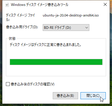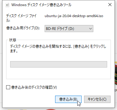 さっそく、この記事を書いている時点で最新の、Ubuntu 20.04 LTSのISOイメージファイルをDVD-Rに書き込んでみました。