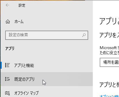 「アプリと機能」画面が出てくるので、左サイドのメニューから「既定のアプリ」をクリック。