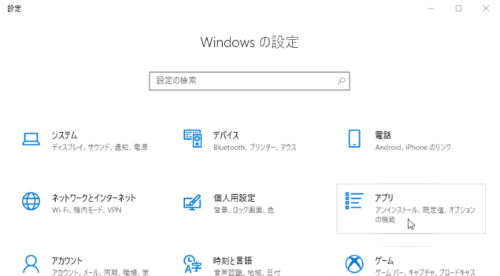 「Windowsの設定」画面が開いたら、「アプリ」をクリックします。