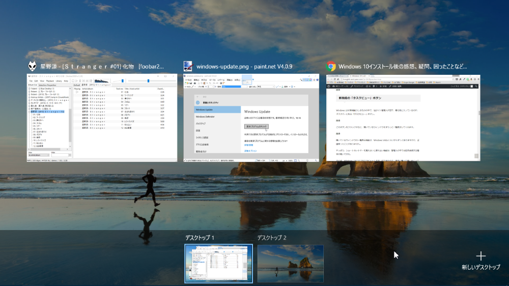 その点、Windows 10には「タスクビュー」ボタンができたので、調子に乗って使いまくってます(笑)。