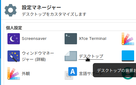 壁紙の変更は、「設定マネージャー」の「デスクトップ」から行えます。