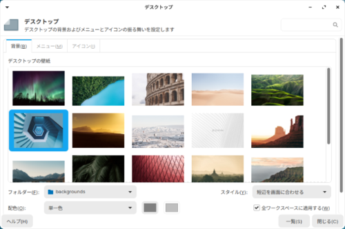 その1つ上の階層の、「/usr/share/backgrounds」フォルダがデフォルトの壁紙ファイルの場所になっているので、選択すると、あらかじめ用意されている風景写真などの壁紙ファイルを選べるようになります。