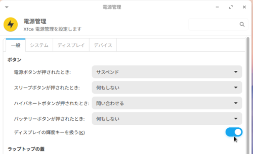また、これもUSBブート版でもそうなのですが、ノートPCの画面の明るさ(輝度)を調整するファンクションキーが、デフォルトで無効になっています。